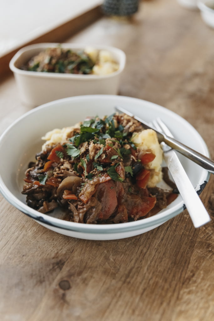 Stoof van paddenstoelen met hete bliksem van aardappel, appel en zuurkool met broodkruim en gehakte noten.